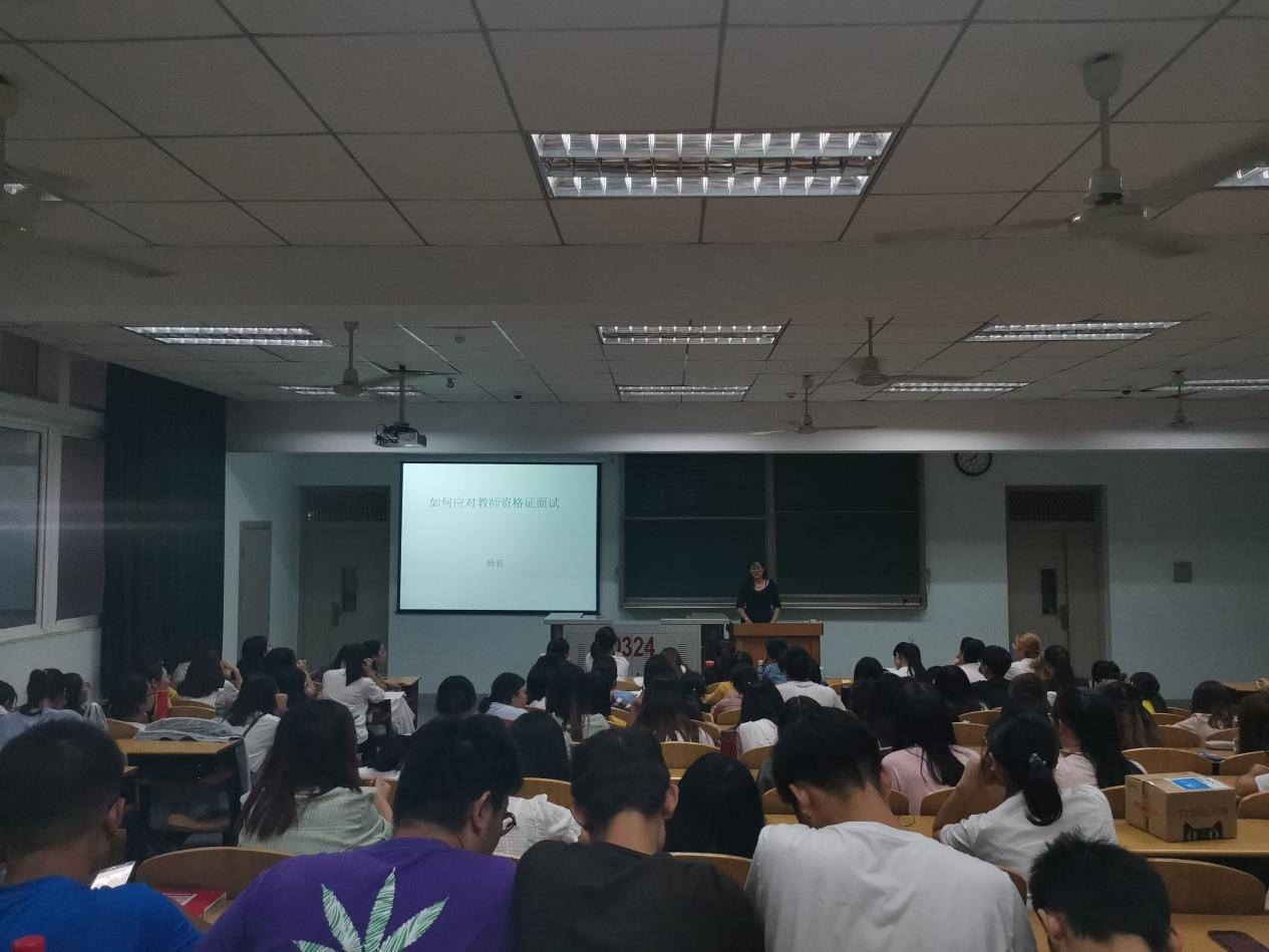 (通讯员 王杰)9月25日晚,2019年下半年教资考试笔试、面试经验交流会在13-D-324成功举行。本次培训会由中文系主任杨蓉老师组织,主讲人为中文师范11601班的李娟同学,近百名报名参加本次教资考试的学生参加。
