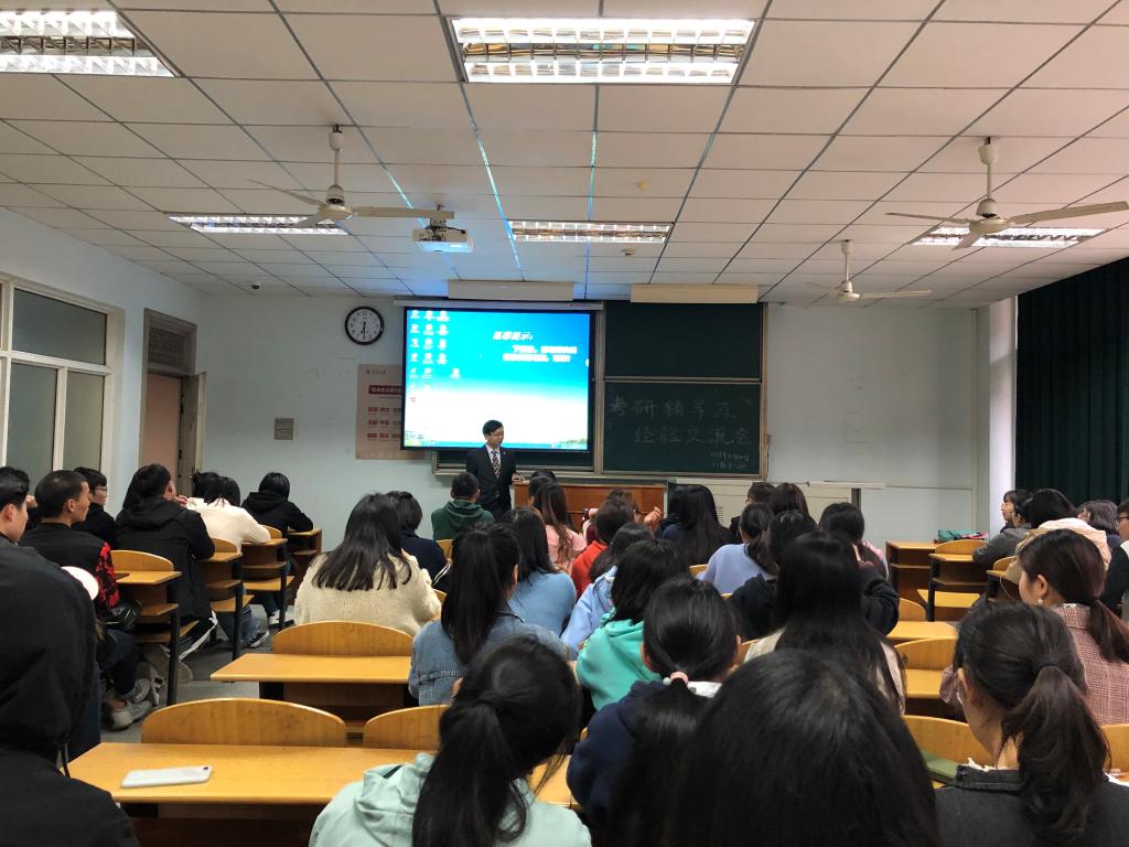 接着,由考研成功的学长、学姐分享考研经验。戴昌茂学长用两组数据指出了报考本校的优势,并鼓励大家报考本校。包宝伦学长给大家推荐了考研书目并分享了自身考研的方法,如:利用微信公众号、APP、百度网盘等工具搜集考研资料;重视历年真题,最好一篇一篇的过,一遍一遍刷;合理安排复习时间,前期重视专业课和英语,后期开始复习政治,考试时间上勿以熟悉而多写,勿以陌生而不答。张畅学姐特别强调了英语的重要性,学生可以结合自身的英语水平选择报考院校。刘迪学姐指出在复习时应尽可能的阅读多版教材,多研究历年真题,通过时间规划表合理安排复习时间。易文艳学姐给大家提供了一些心态上的建议,如:注意劳逸结合,避免长时间、高强度学习 ;后期要注意调整心态,不想太多,不放弃,把考研当做一项平常的任务;复习时不要自我感动,不要盲目复制别人的成功,找到属于自己的方法。