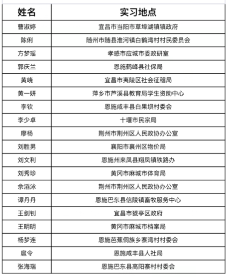 习近平总书记一再教诲青年人:“要不怕困难、攻坚克难,勇于到条件艰苦的基层、国家建设的一线,经受锻炼,增长才干。”2018年暑期,文学院2017级历史系的19位同学,分赴湖北省宜昌、襄阳、孝感、随州、黄冈、荆州、恩施土家族自治区及江西省萍乡市各级政府部门参加暑期实习实训活动。在实习过程中,同学们吃在基层、住在基层,切身体验了基层建设的新成就;向各级领导和同事学习,了解了政府部门的工作环境,熟悉了相关的工作技能,为日后的成长提供了助力;同时,在基层实习期间,同学们积极帮助市县乡各级政府部门建言献策、并亲身参与了暑期的防汛抗旱工作,得到了服务单位的一致好评。此外,还有一名同学在暑假期间,积极报名参军,现已成为一名光荣的解放军战士。以上种种,已经充分证明2017级历史系是一个善于学习,勇于奉献的优秀集体。通过暑期在基层的实习,学生学习到了课本上难以学到的知识,培养了将书本知识和实际事务结合起来的能力,也向外界展示了williamhill中文文学院学生青春、朝气、踏实、奉献的优良形象。