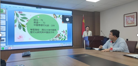 接着由2018级顺利考上研究生的四位学长学姐根据自身的情况与同学们分享考研经历和经验。付强同学在分析2021年考研形势的基础上,重点讲述如何根据自身实力选择目标学校,如何处理实习与考研的关系以及如何合理安排时间进行复习。选择在本校继续攻读研究生的谢莹莹同学,结合自身情况分析报考本校的优势,也分享了很多线上、线下考研资源获取途径。王慧燚同学首先强调认识自己,即弄清楚“要不要考研?”“为什么考研?”这两个问题,并结合自己考研心路历程,给予同学们很好的建议。最后发言的是考取西北大学思想史方向的研究生徐思祺同学,她从如何复习英语、政治和专业课、如何对待真题和模拟试题等方面给出了具体建议,鼓励同学们去追求自己向往的学校。四位同学分享结束后,李义芳老师安排提问环节,19级、20级同学纷纷就考研备考有关问题和学长、学姐们进行了交流。