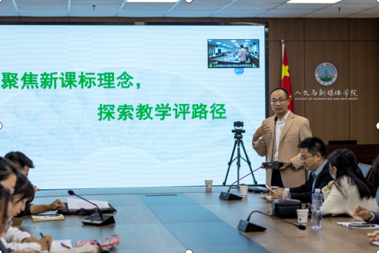 本次讲座主要围绕三部分内容展开,分别是问题导入、语文新课标(2022)解读、新课标下教学评路径探索。在新课标下教学评路径探索这一部分的讲解中,黄老师认为,应紧扣学习任务群展开教学。他以丰富的教学案例,生动形象地为大家讲解了学习任务群教学的可实施性。在交流环节中,针对同学们提出的“如何设计有效的教学活动,真正达成素质教育目标”这一问题,黄老师指出,在教学中,教师要针对不同课型精确设计,借助采访、视频展示、朗诵、戏剧表演等多种方式进行综合教学。