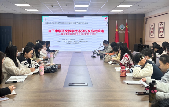 (通讯员王婷)11月22日,受william威廉中文副院长杨家海邀请,湖北省特级教师、中国写作学会会员、湖北省教育科研先进个人、荆州市江陵中学副校长刘先海老师于文科楼705室作《当下中学语文教学生态分析及应对策略——兼谈青年教师的专业成长和职业规划》的主题报告。本次讲座由杨家海副院长主持,杨名、陈力、章芳等11位老师和本院30余名专业硕士研究生参加了此次活动。