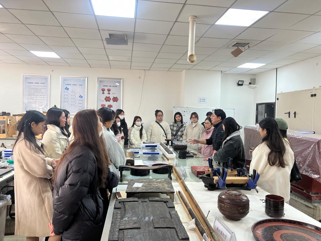 在漆器修复室,各类从春秋战国到明清时期的漆器琳琅满目,造型丰富多样。髹漆技艺在中国古代源远流长,特别是春秋战国时期楚国的髹漆技艺最为高超,吴昊以“买椟还珠” 的典故,生动阐释了漆器在古代日常生活中的重要地位,并详细介绍了当前的漆器修复工艺,以及先秦与汉代漆器在纹饰、材质上的差异,唤起了师生们参观荆州博物馆漆器展厅的记忆。