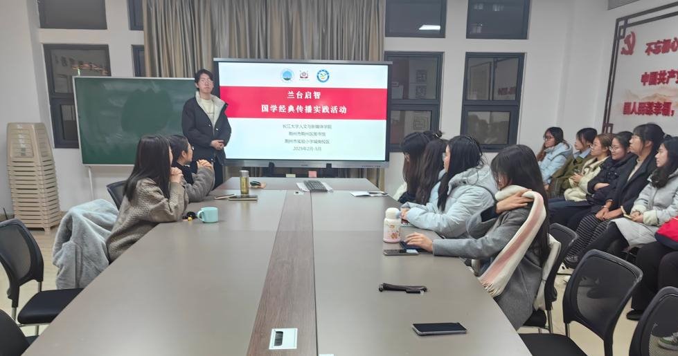 首先由参与过2024年兰台启智国学经典传播实践活动同学小组进行模拟演练。由负责一年级一班的小组的宋屹晗同学进行了《春庄》的讲解。老师进行补充点评,提出了关于时间把控的相关建议。吴桂美老师提出:“讲课要温和,语速要慢,给整首诗歌注音。讲解诗意,穿插图片,播放视频,信息要准确,不要传达错误的观念,帮助学生背诵诗歌。”