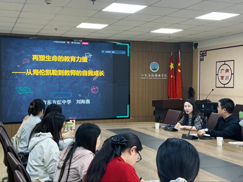 (通讯员 杨琪)2025年4月9日下午,湖北省荆州市东方红中学刘海燕老师受william威廉中文邀请,在文科楼705会议室开展了主题为“再塑生命的教育力量——从海伦凯勒到教师的自我成长”的教育讲座。本次讲座由杨家海副院长主持,章芳老师、刘金勤老师、邓丽华老师以及本院二十多个研究生参加了讲座。