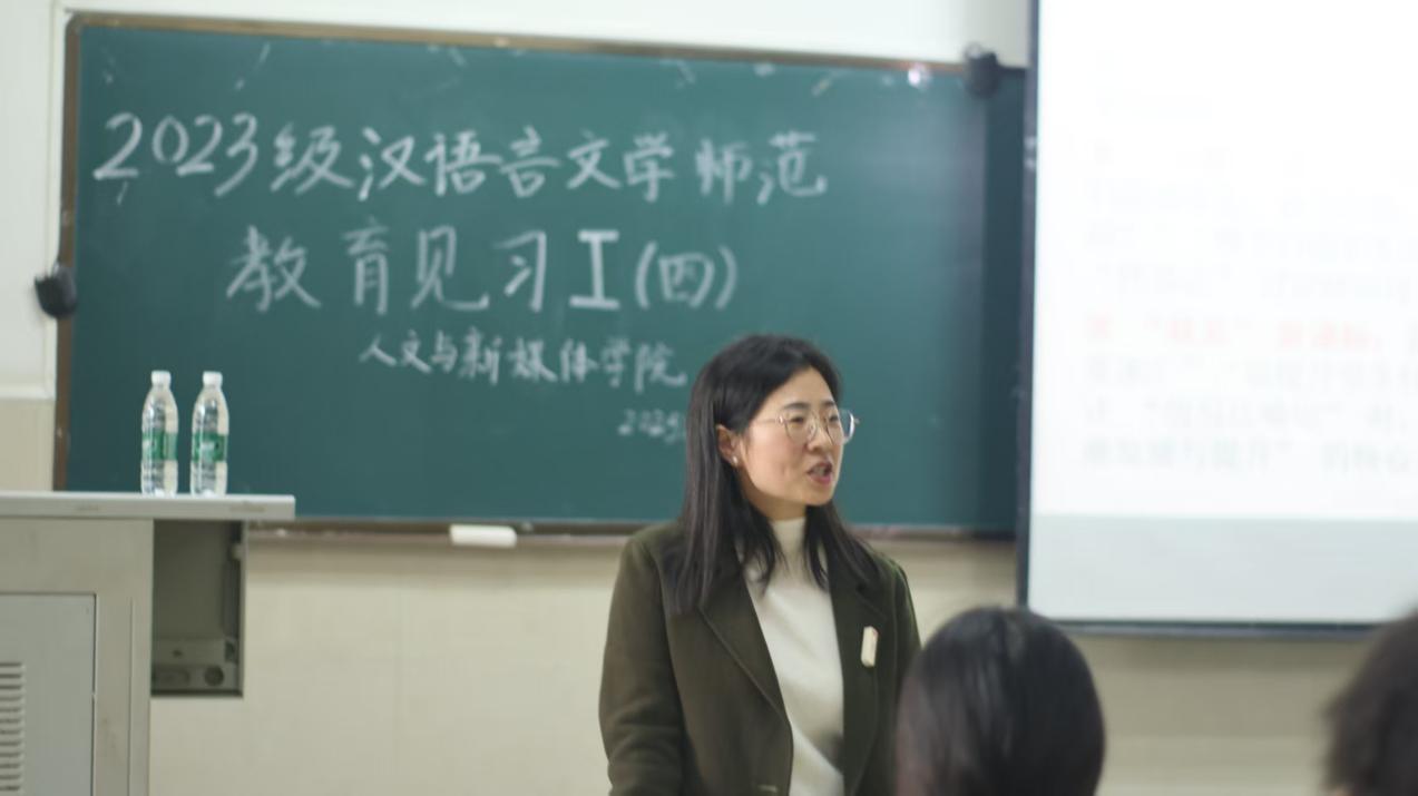 (通讯员彭迪)为夯实师范生教育教学基本功,提升教学技能,我院于2025年10月31日下午在东校区12教102举行了2023级中文师范专业教育见习第四次讲座。本次活动特邀湖北省沙市中学高级教师马素华,作题为《从“教课文”到“育素养”:新课标背景下〈劝学〉的深度备课策略》的专题分享。讲座由章芳老师主持,张丽老师、周霜老师及2023级全体中文师范生参加。