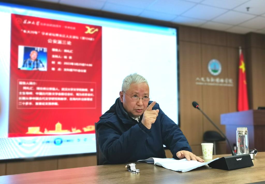 3月25日下午,由我院主办的“长大20年”学术论坛暨长江人文讲坛第124讲在文科楼705会议室开讲。本次讲坛的主讲人是武汉大学文学院博士生导师熊礼汇教授,讲座题目是《公安派三论》。参加本次讲坛的嘉宾有武汉大学文学院戴贤红教授、荆州市三袁文化协会王福学主席、荆州职业技术学院李霁教授、荆州市著名散文家叶继程先生、著名诗人浮石、叶脉、作家李国新等三袁文化协会的专家学者。杨蓉老师主持讲座,章芳老师和中文系50多名研究生一道参与本次讲座。