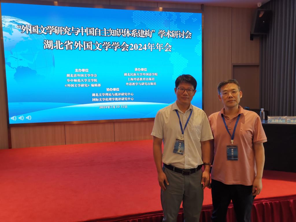 2024年7月10-12日,作为学会常务理事,我院教师秦鹏举、朱道卫参加了湖北省外国文学学会2024年年会,会议主题为“外国文学研究与中国自主知识体系建构”。本次研讨会由湖北省外国文学学会、华中师范大学文学院及《外国文学研究》编辑部联合主办,由湖北民族大学外国语学院、上海外语教育出版社及外语教学与研究出版社共同承办,来自清华大学、南京大学、上海交通大学、华中师范大学、武汉大学等30余所高校的专家学者莅临参会,共同交流外国文学研究的时代趋势和前沿视野,研讨中国自主知识体系的建构路径和发展方向。