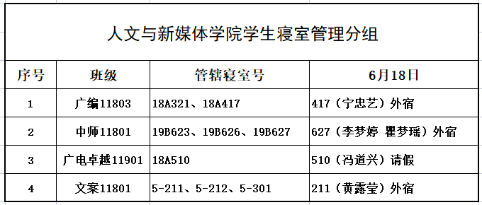 6月18日,我院组织学生干部对18、19级的宿舍进行每日寝室安全检查,现将查寝结果公布如下: