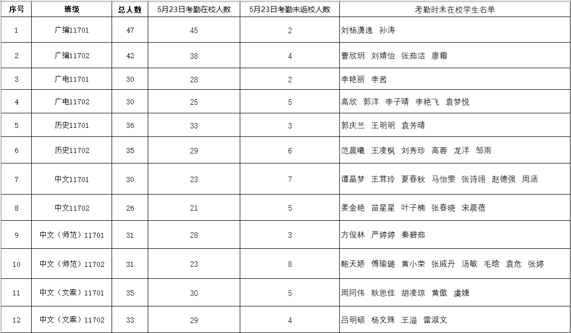 根据《关于加强毕业生毕业期间教育管理工作的通知》精神,现对5月23日2017级毕业生毕业期间在校考勤具体情况通报如下: