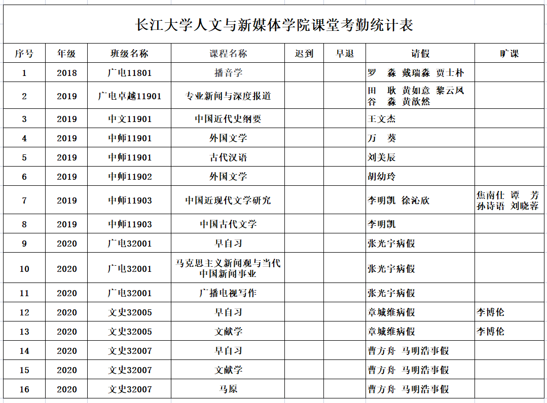 5月21日,我院组织学生干部对18、19、20级30个班的21门课程进行了45次课堂考勤,100%到课率29次,现将考勤结果公布如下: