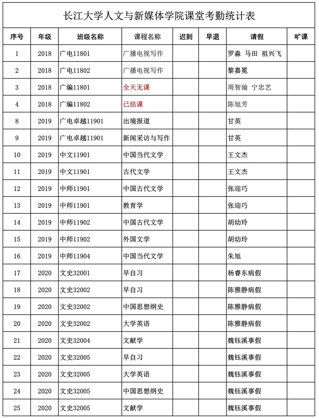 5月12日,我院组织学生干部对18、19、20级30个班的23门课程进行67次课堂考勤,100%到课率42次,现将考勤结果公布如下: