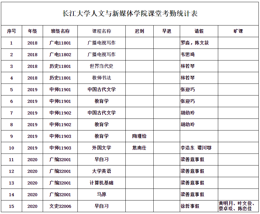 5月10日,我院组织学生干部对18、19、20级30个班的21门课程进行68次课堂考勤,100%到课率53次,现将考勤结果公布如下: