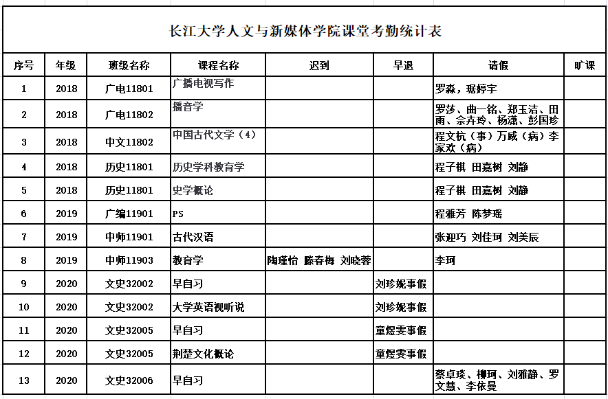 4月29日,我院组织学生干部对18、19、20级30个班的20门课程进行56次课堂考勤,100%到课率43次,现将考勤结果公布如下: