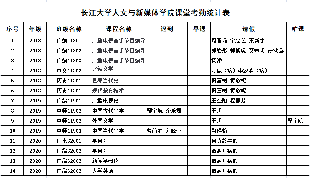 4月28日,我院组织学生干部对18、19、20级30个班的21门课程进行62次课堂考勤,100%到课率48次,现将考勤结果公布如下: