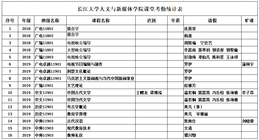 4月25日,我院组织学生干部对18、19、20级30个班的34门课程进行71次课堂考勤,100%到课率55次,现将考勤结果公布如下:
