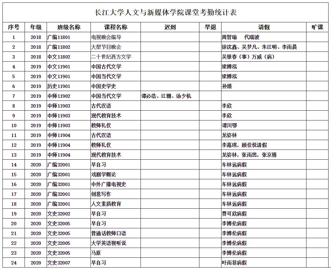 4月20日,我院组织学生干部对18、19、20级30个班的33门课程进行了68次课堂考勤,100%到课率45次,现将考勤结果公布如下: