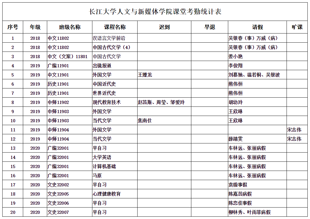 4月19日,我院组织学生干部对18、19、20级30个班的24门课程进行了67次课堂考勤,100%到课率47次,现将考勤结果公布如下: