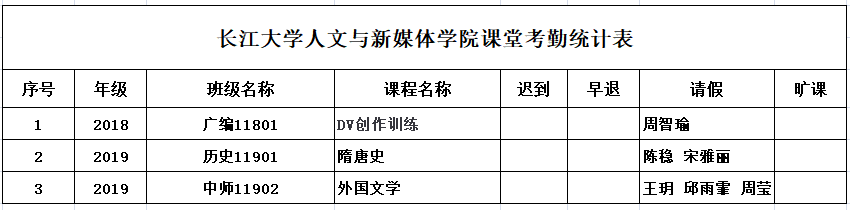 4月16日,我院组织学生干部对18、19、20级30个班的23门课程进行了55次课堂考勤,100%到课率52次,现将考勤结果公布如下: