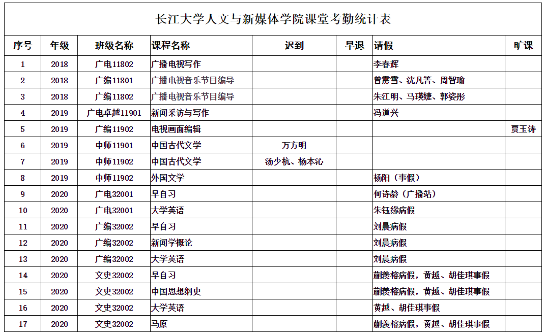 4月14日,我院组织学生干部对18、19、20级30个班的24门课程进行了68次课堂考勤,100%到课率45次,现将考勤结果公布如下: