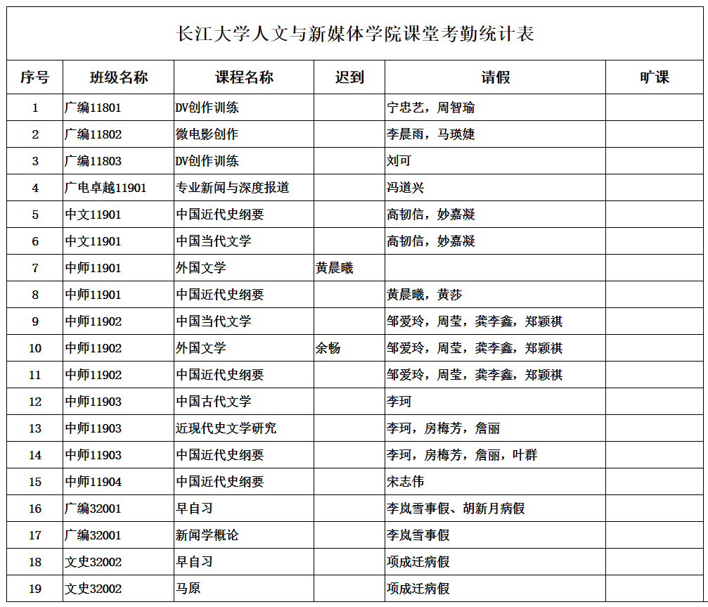 4月9日,我院组织学生干部对18、19、20级30个班的25门课程进行了61次课堂考勤,100%到课率40次,现将考勤结果公布如下: