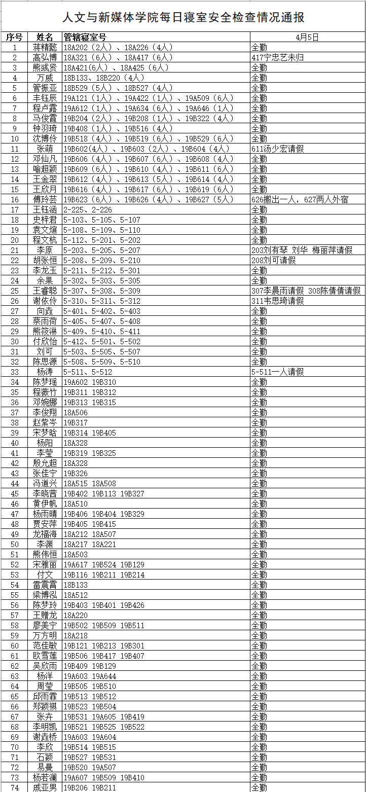 4月5日,我院组织学生干部对18、19级的宿舍进行每日寝室安全检查,现将考勤结果公布如下: