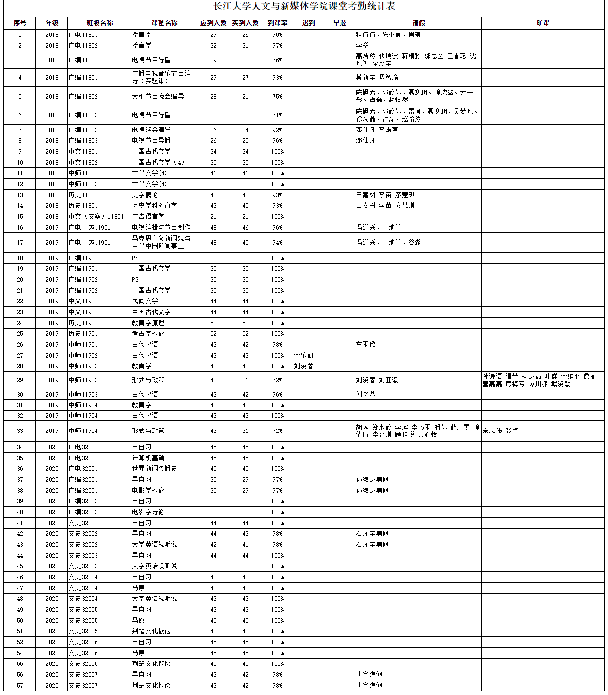 4月1日,我院组织学生干部对18、19、20级30个班的27门课程进行了57次课堂考勤,100%到课率34次,现将考勤结果公布如下: