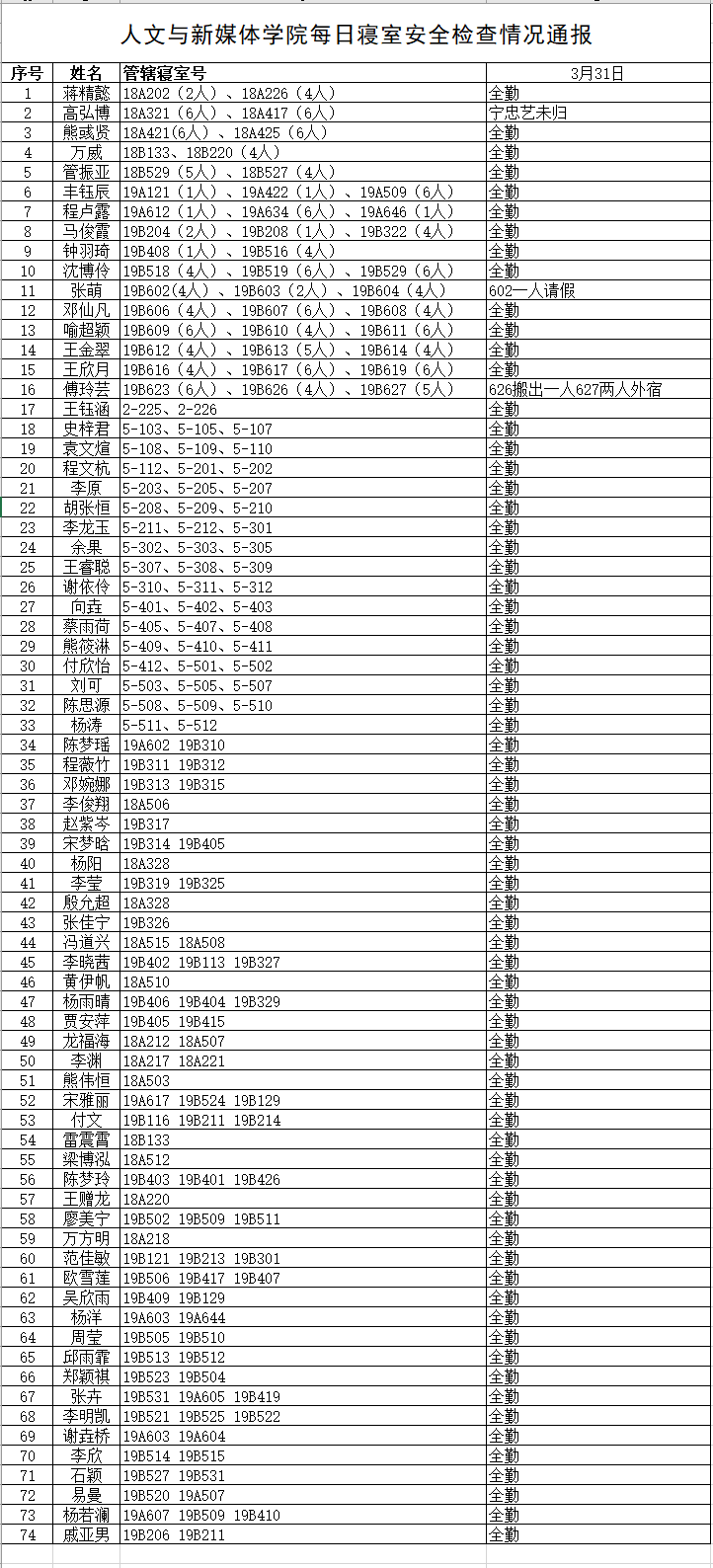 3月31日,我院组织学生干部对18、19级的宿舍进行每日寝室安全检查,现将考勤结果公布如下: