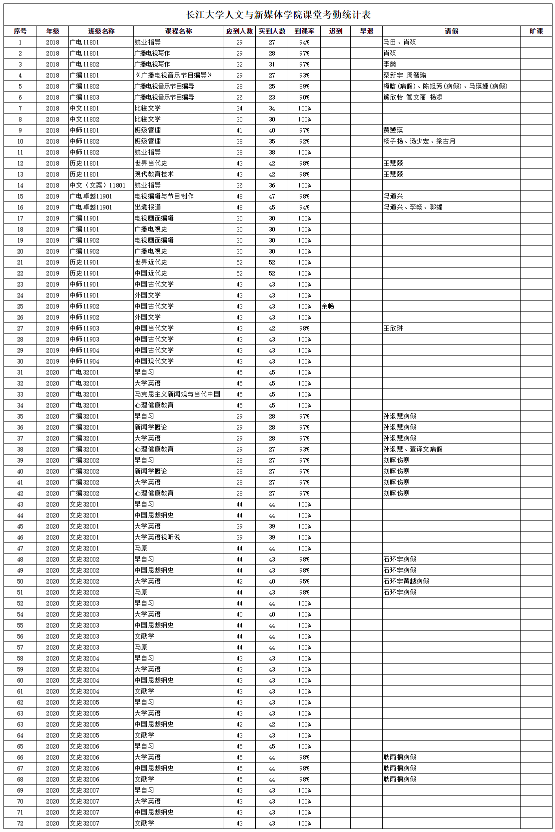 3月31日,我院组织学生干部对18、19、20级30个班的32门课程进行了72次课堂考勤,100%到课率44次,现将考勤结果公布如下: