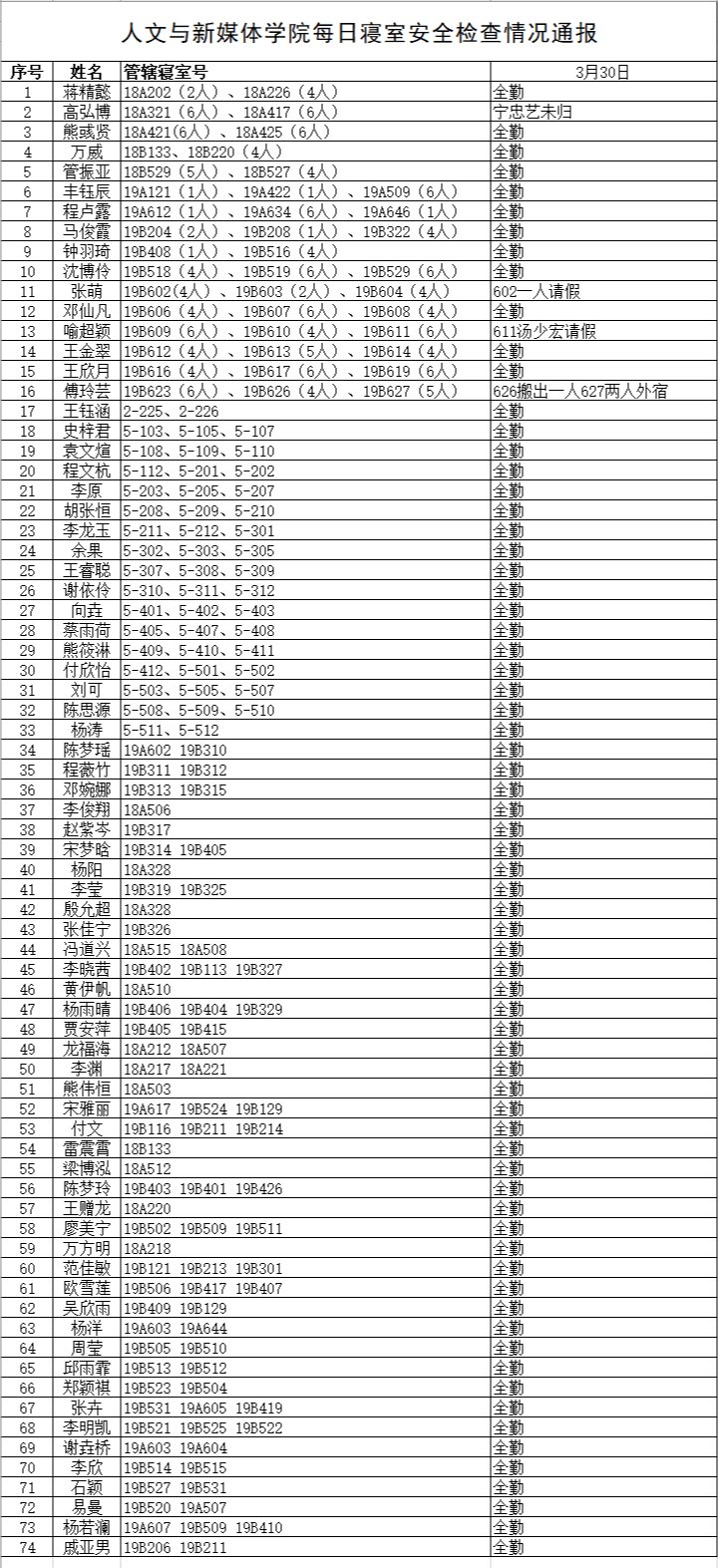 3月30日,我院组织学生干部对18、19级的宿舍进行每日寝室安全检查,现将考勤结果公布如下: