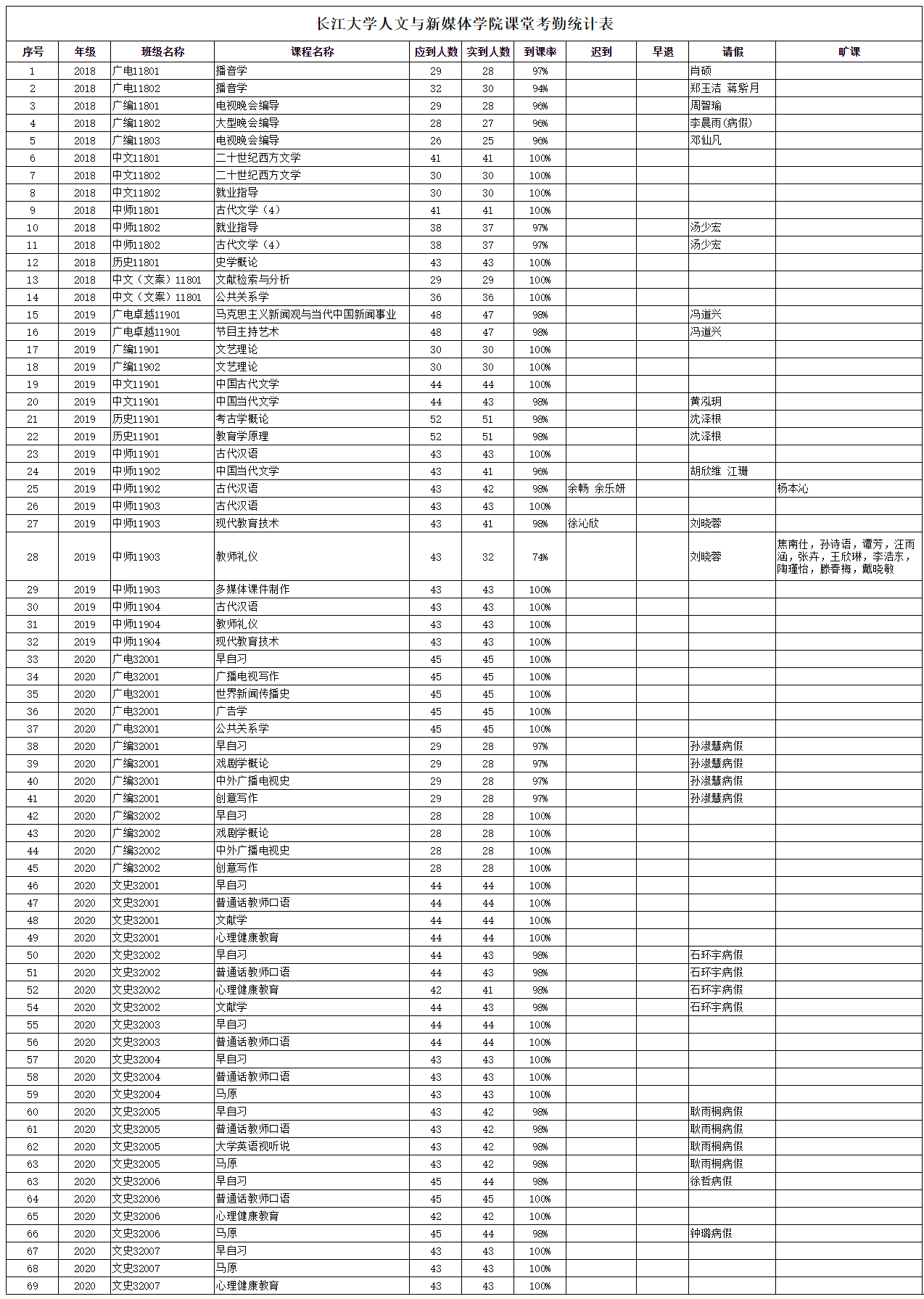 3月30日,我院组织学生干部对18、19、20级30个班的32门课程进行了69次课堂考勤,100%到课率39次,现将考勤结果公布如下:
