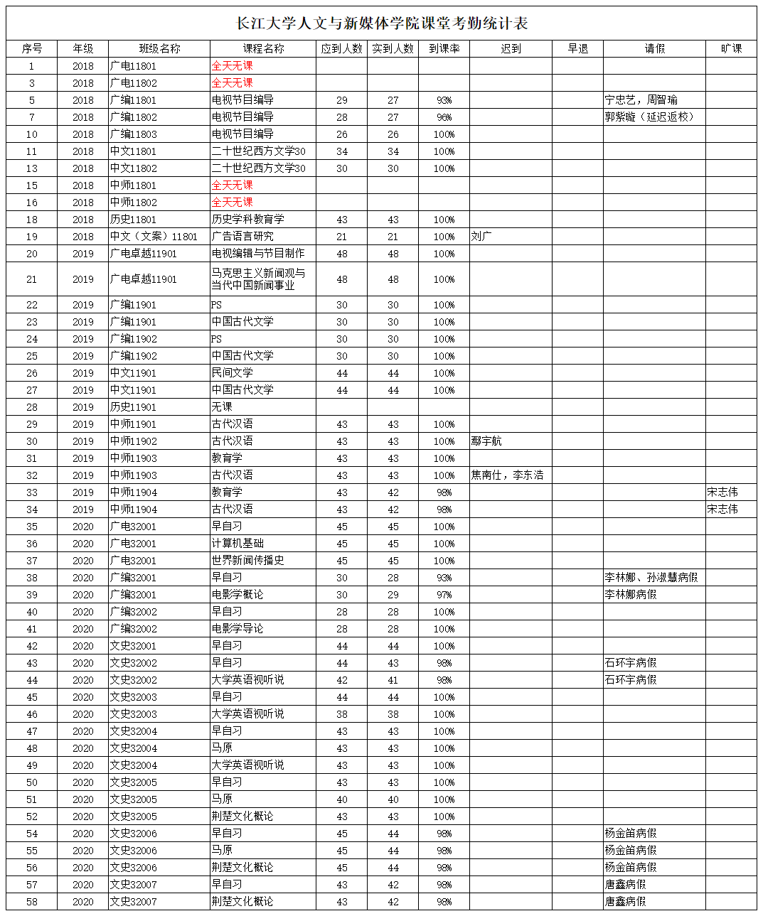 3月25日,我院组织学生干部对18、19、20级30个班的19门课程进行了58次课堂考勤,100%到课率31次,现将考勤结果公布如下: