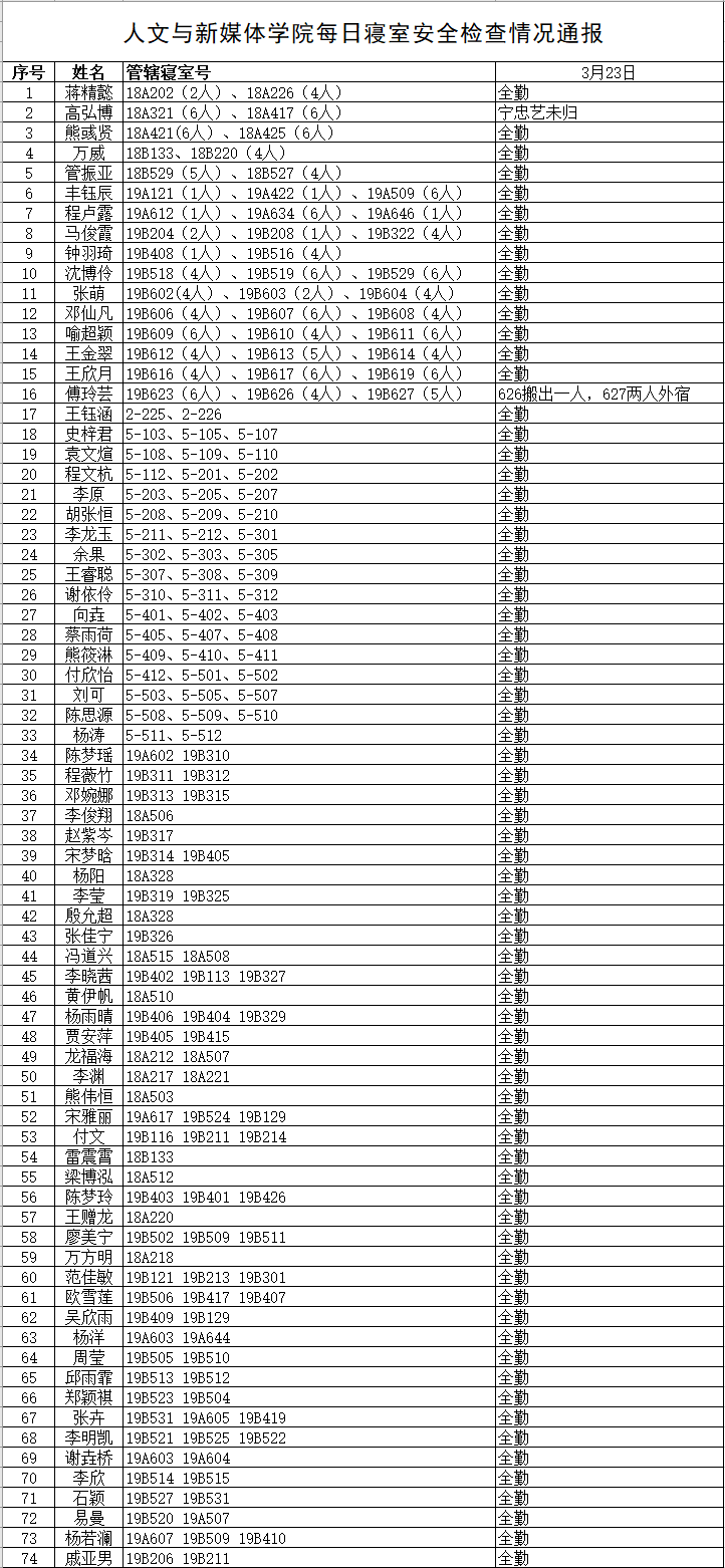 3月23日,我院组织学生干部对18、19级的宿舍进行每日寝室安全检查,现将考勤结果公布如下:
