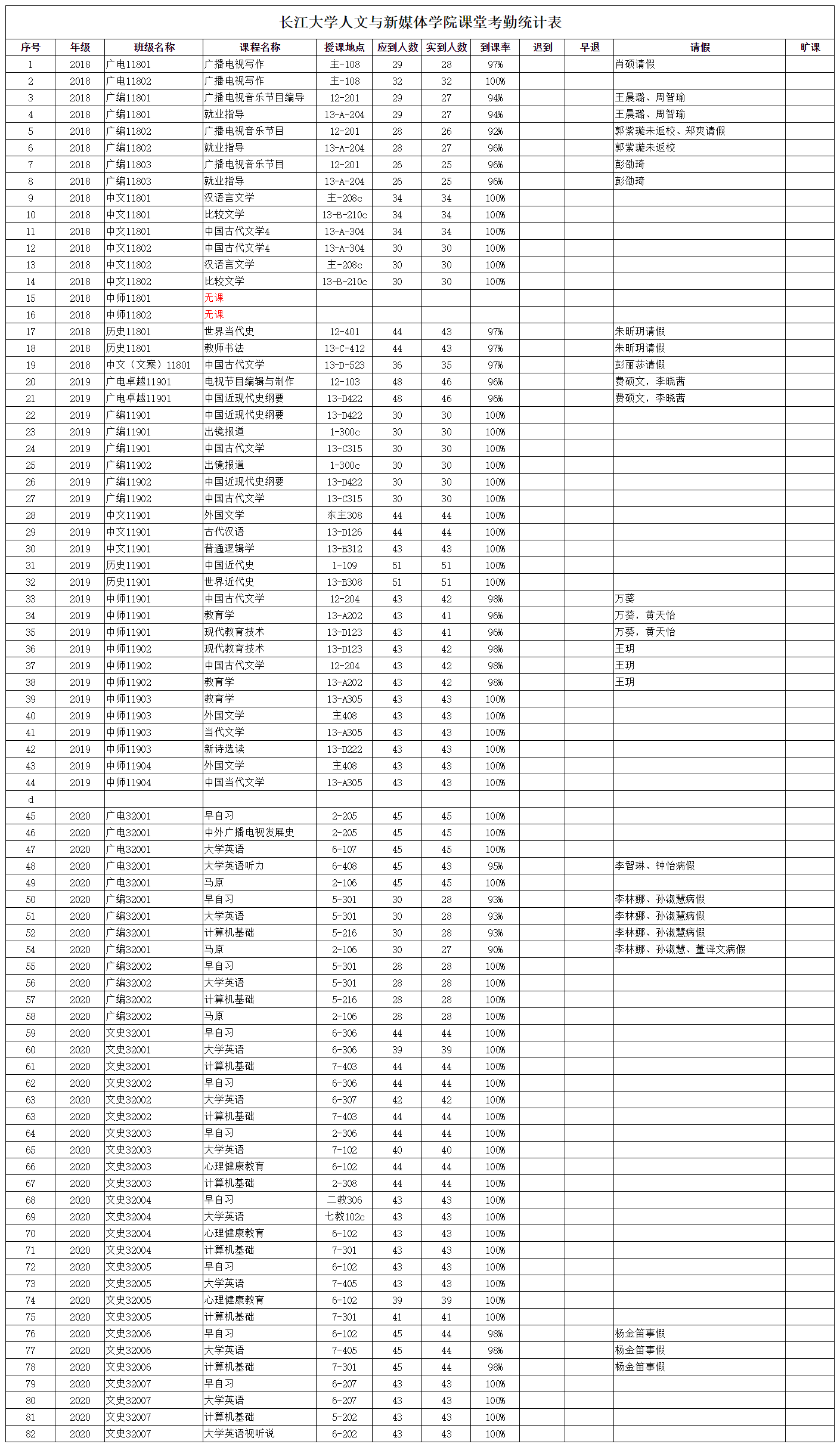 3月22日,我院组织学生干部对18、19、20级30个班的31门课程进行了82次课堂考勤,100%到课率54次,现将考勤结果公布如下:
