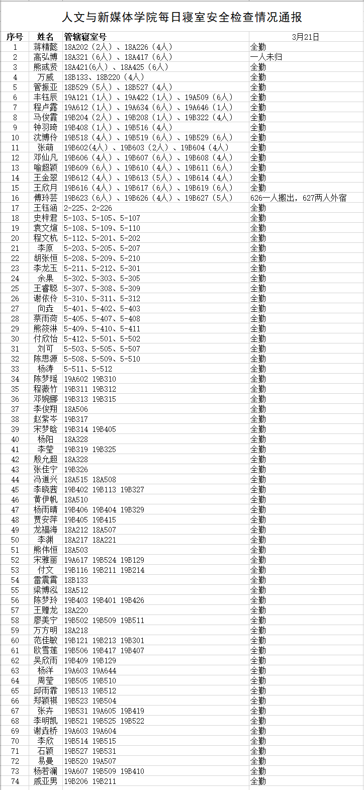 3月21日,我院组织学生干部对18、19级的宿舍进行每日寝室安全检查,现将考勤结果公布如下: