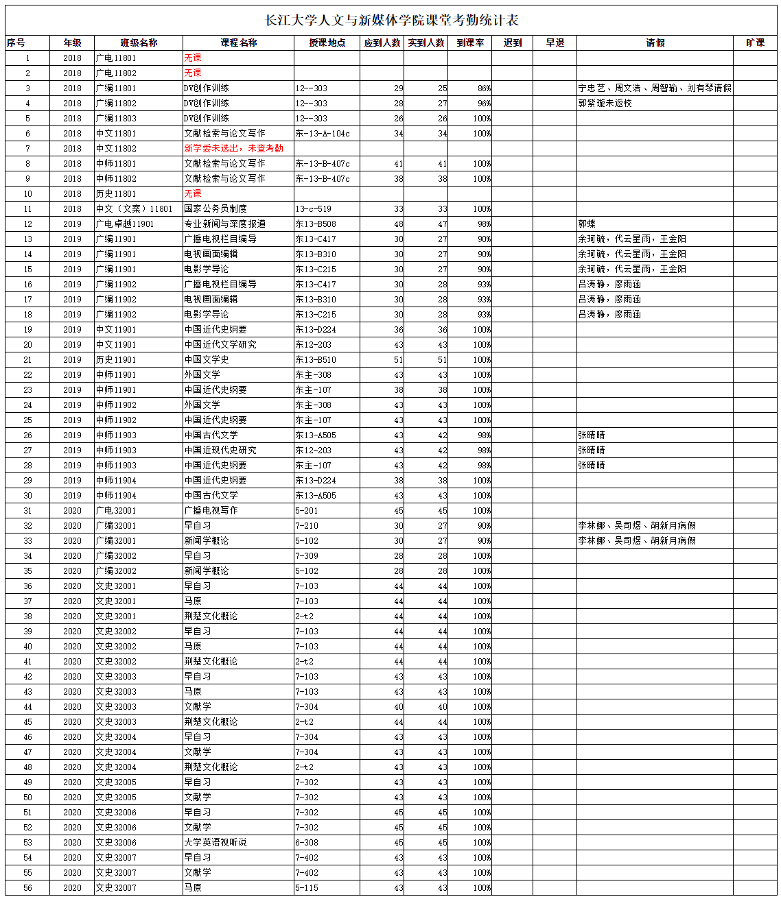 3月12日,我院组织学生干部对18、19、20级30个班的20门课程进行了56次课堂考勤,100%到课率38次,现将考勤结果公布如下: