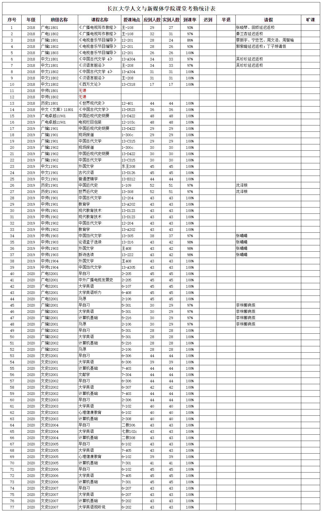 3月8日,我院组织学生干部对18、19、20级30个班的30门课程进行了75次课堂考勤,100%到课率59次,现将考勤结果公布如下: