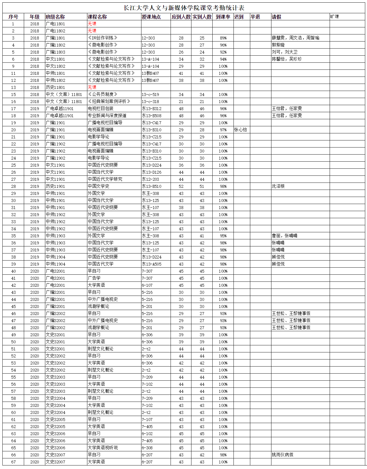 3月5日,我院组织学生干部对18、19、20级30个班的24门课程进行了64次课堂考勤,100%到课率43次,现将考勤结果公布如下: