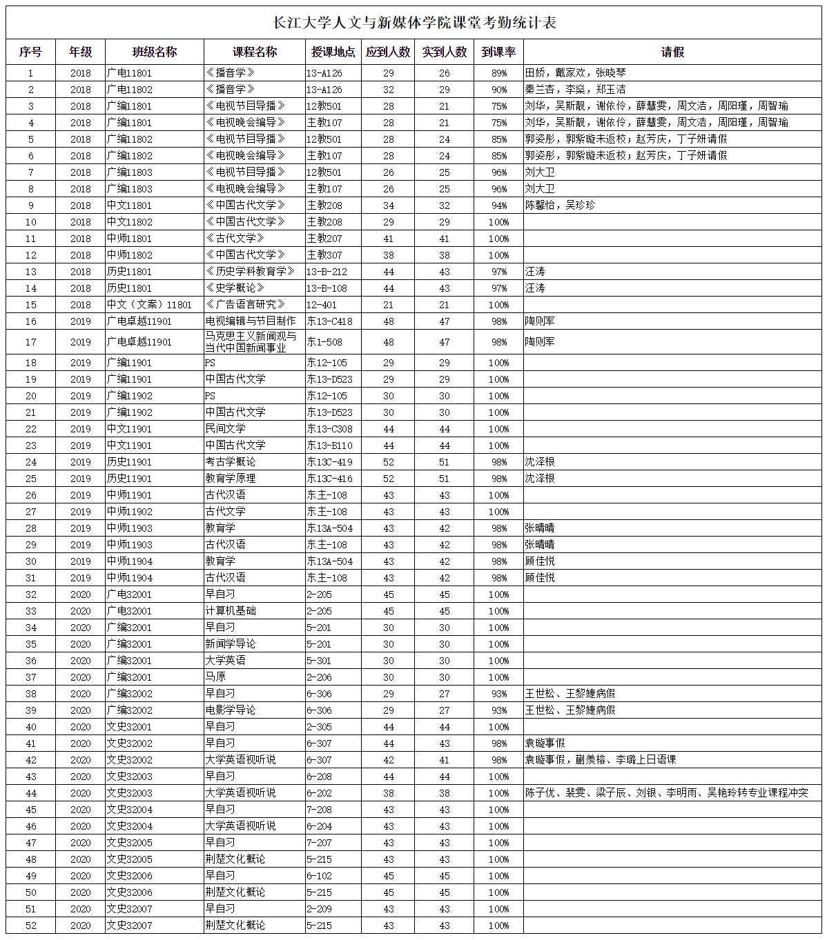 3月4日,我院组织学生干部对18、19、20级30个班的24门课程进行了52次课堂考勤,100%到课率29次,现将考勤结果公布如下:
