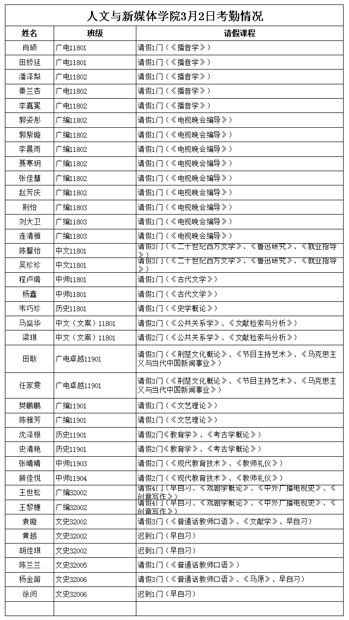 3月2日,我院组织学生干部对18、19、20级的30个班的13门课程进行了68次课堂考勤,100%出勤次数61次,现将缺勤情况通报如下:
