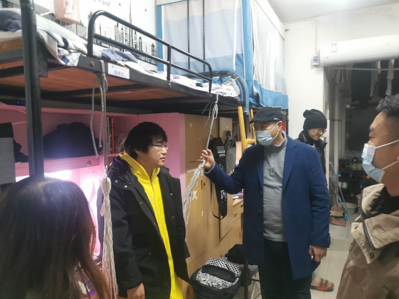 (通讯员 鄢宇航)绷紧疫情防控弦,抓牢寝室安全线。12月10日晚,我院党委副书记胡世先等一行走进南苑宿舍,巡查寝室卫生、用水用电安全情况,并和我院同学们促膝长谈,交流畅言。