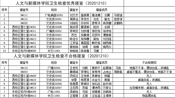 在第15周宿舍安全卫生情况检查中西校区有6个不合格宿舍,东校区有2个不合格宿舍,西校区有9个宿舍被评定为“优秀”,东校区有1个宿舍被评定为“优秀”。为规范宿舍卫生状况,经学院学工办研究,决定给予以下不合格宿舍通报批评,优秀宿舍予以通报表扬。希望各宿舍向优秀宿舍学习,优秀宿舍再接再厉,不合格宿舍做好整改工作。