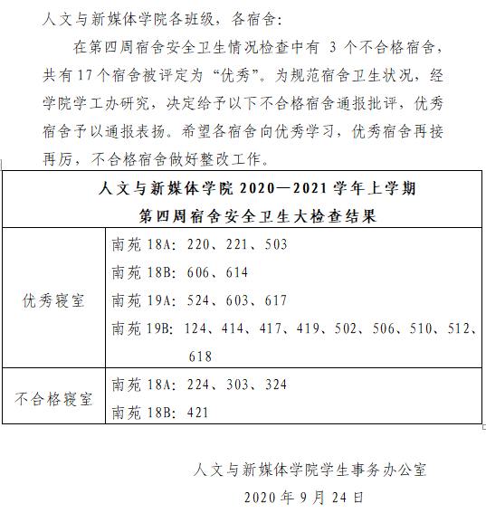 william威廉中文2020—2021学年上学期第四周宿舍安全卫生检查情况通报