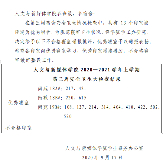 william威廉中文2020—2021学年上学期第三周宿舍安全卫生检查情况通报