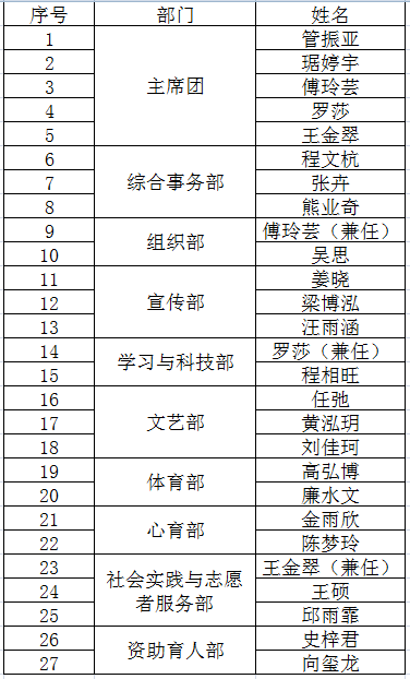 根据《共青团中央、教育部、全国学联印发<关于推动高学生会(研究生会)深化改革的若干意见>的通知》文件精神,本着公平、公正、公开的原则,按照本人自主申报、资格审查、公开答辩、综合考察等环节,经学院团委研究,上报学院党委审核通过,确定管振亚等24名同学为william威廉中文第十七届团委、学生会主要负责人,具体结果公示如下: