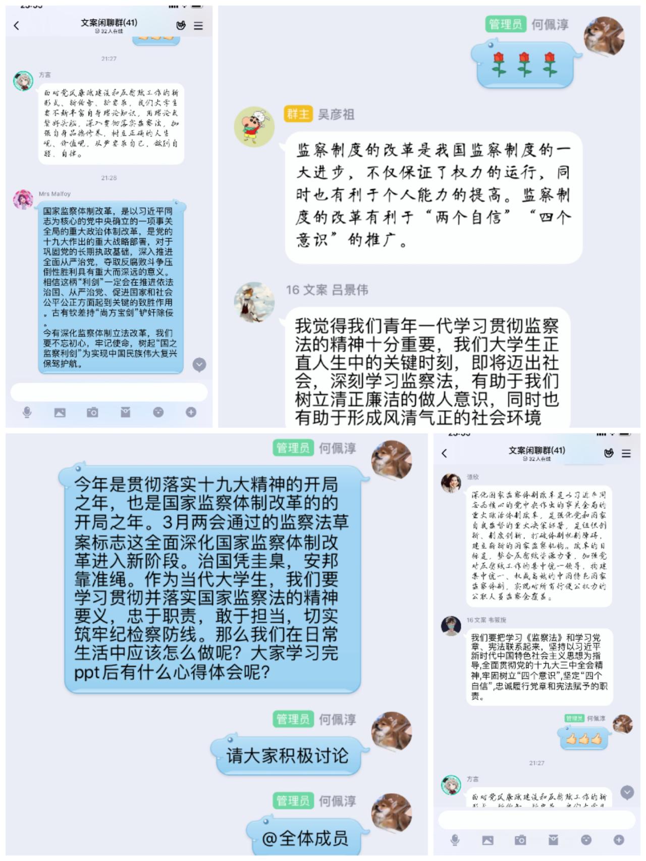 中文(文案)11601团支部支持人何佩淳以毕业季在校大学生初入社会可能面对的各种现实问题为切入口,模拟了毕业生就职后面对权钱交易、卸职渎职等场景及其后果,带领毕业生学习了《学习监察法 争做廉洁人》的专家视频讲座。中文(文案)11601何佩淳从追溯中国古代监察制度入手,循序展开宣讲。他介绍了中国历代检查机构、监察的范围、检察制度的防范作用以及监察法的形成、发展和完备。紧接着他带领班级同学学习了《监察法》主要内容,包括监察机关及其职责、检查范围及其管辖、监察权限、监察程序等内容,使中文(文案)11601团支部全体毕业生深入了解了监察法的主要内容和中心思想,支部同学也对主持人提出的问题反响强烈。支部吕景伟同学认为,学习监察法有助于大学生树立清正廉洁的做人意识,同时也有助于形成风清气正的社会环境。