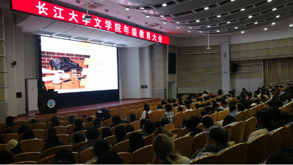11月24日晚,文学院本科生年级教育大会在12-405举行,文学院党委副书记胡世先、辅导员严实、万竹君担任大会主讲人,2017、2018级本科生参加了大会。