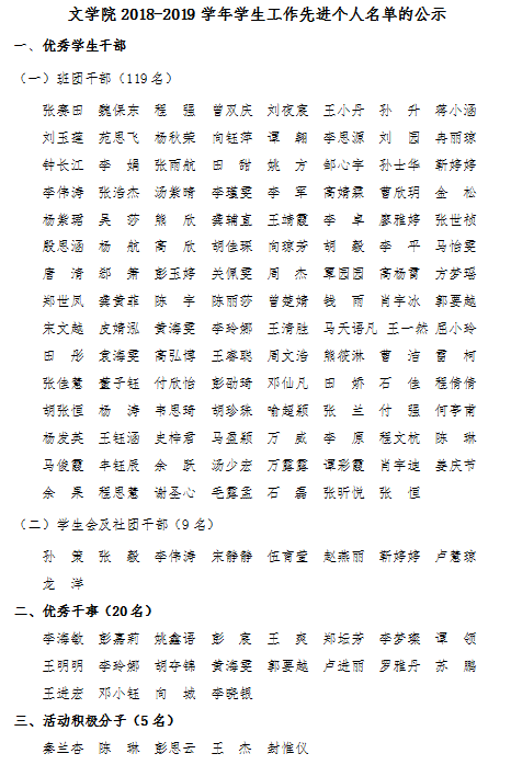 经个人申报、班级评选、学生事务办公室审核,授予张赛田等128名同学“优秀学生干部”称号,授予李海敏等21名同学“优秀学生干事”称号,授予秦兰杏等5名同学“活动积极分子”称号,现将评选结果予以公示。