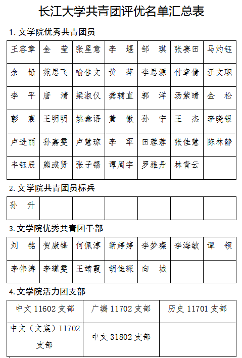 经个人申请、各支部推选、学院团委审核,拟推选王容章等41名同学评为“优秀共青团员”,刘铭等12名同学评为“优秀共青团干部”,孙升评为“共青团员标兵”,中文11602支部、广编11702支部、历史11701支部、中文(文案)11702支部、中文31802支部评为“活力团支部”,现予以公示。