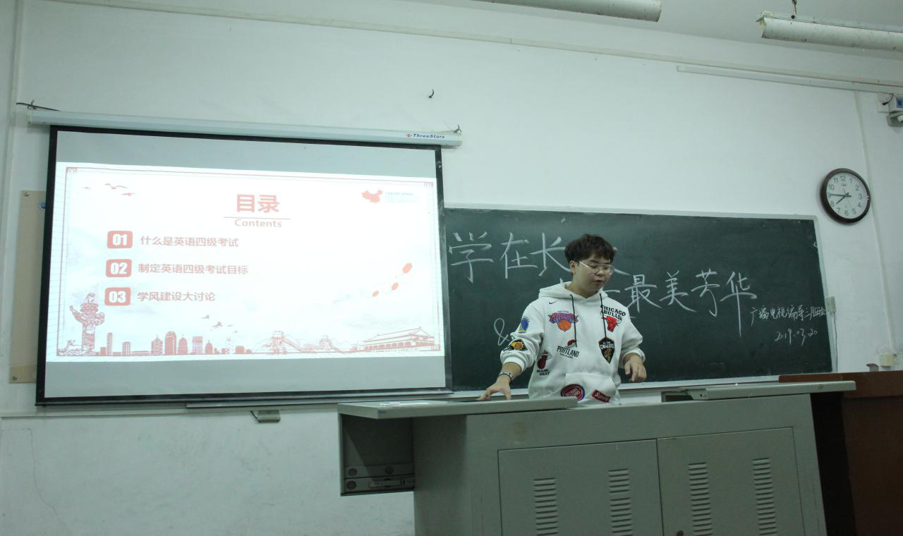 广编31802班主持人围绕“什么是四级考试”、“制定四级考试目标”、“学风建设”三方面开展了本次团会。此次“立学风 备战英语四级”主题班会的开展,使同学们的学习热情与思想觉悟有了进一步的提高,同时也更加确立了自己的人生规划,明确了自身未来的发展方向,起到了加强班级学风建设的良好效果。